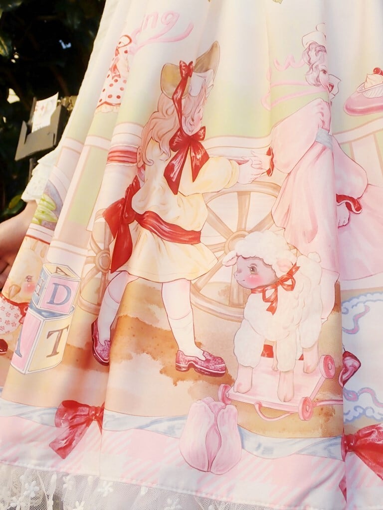 スカートには、子供部屋で楽しそうに遊ぶ少女たちが描かれ、着るお嬢様にも純真な楽しい思い出をプレゼントしてくれることでしょう。