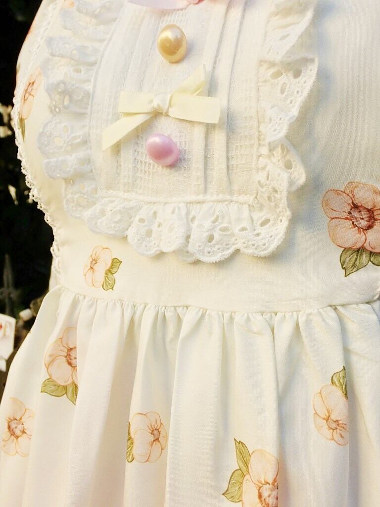 フリルで縁取られた胸元の小さなスクエアヨークには、まるであめ玉のようなかわいい丸ボタンと、ピンクとイエローの小さなリボンが飾られ、ウエストのAラインを生み出すのに欠かせないウエストリボンは、妖精の羽のようなオーガンジー生地で作られています。