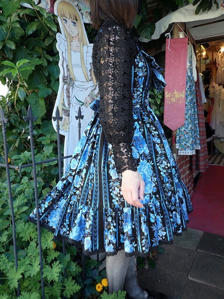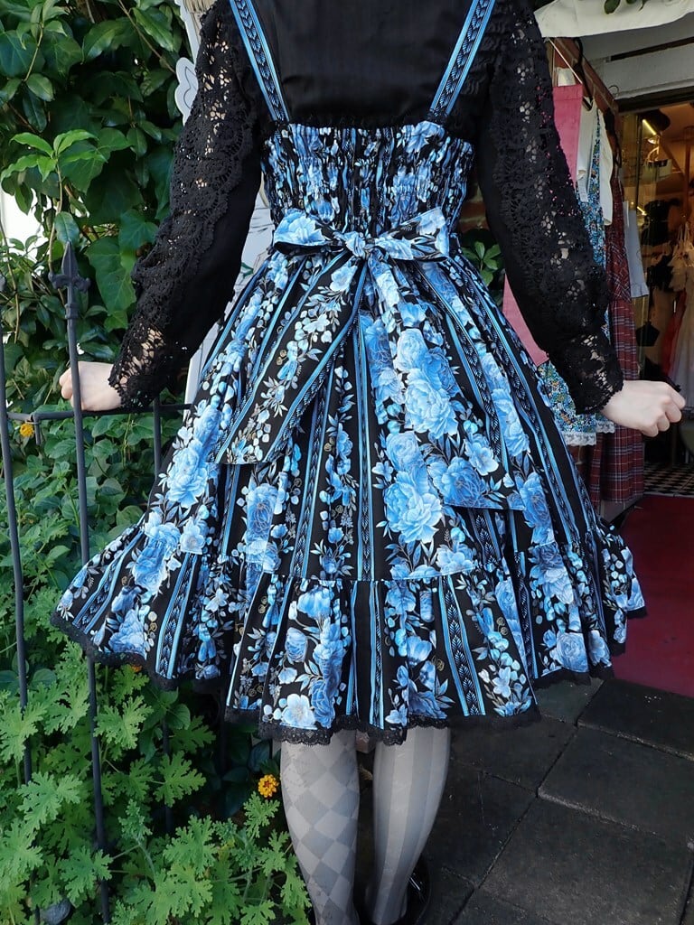 フリルワンピース 青薔薇と黒フリルレースのジャンパースカート