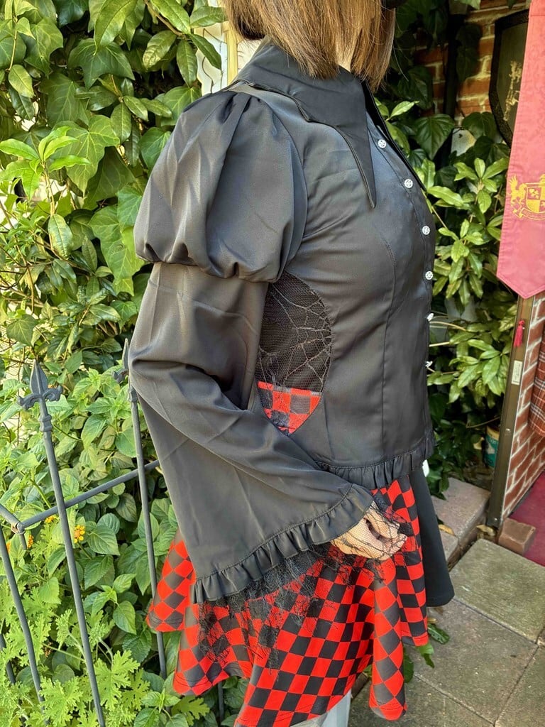 漆黒の闇色の生地にきらりと輝く蜘蛛ボタンがアクセントとなり、全体の空気を引き締めます。