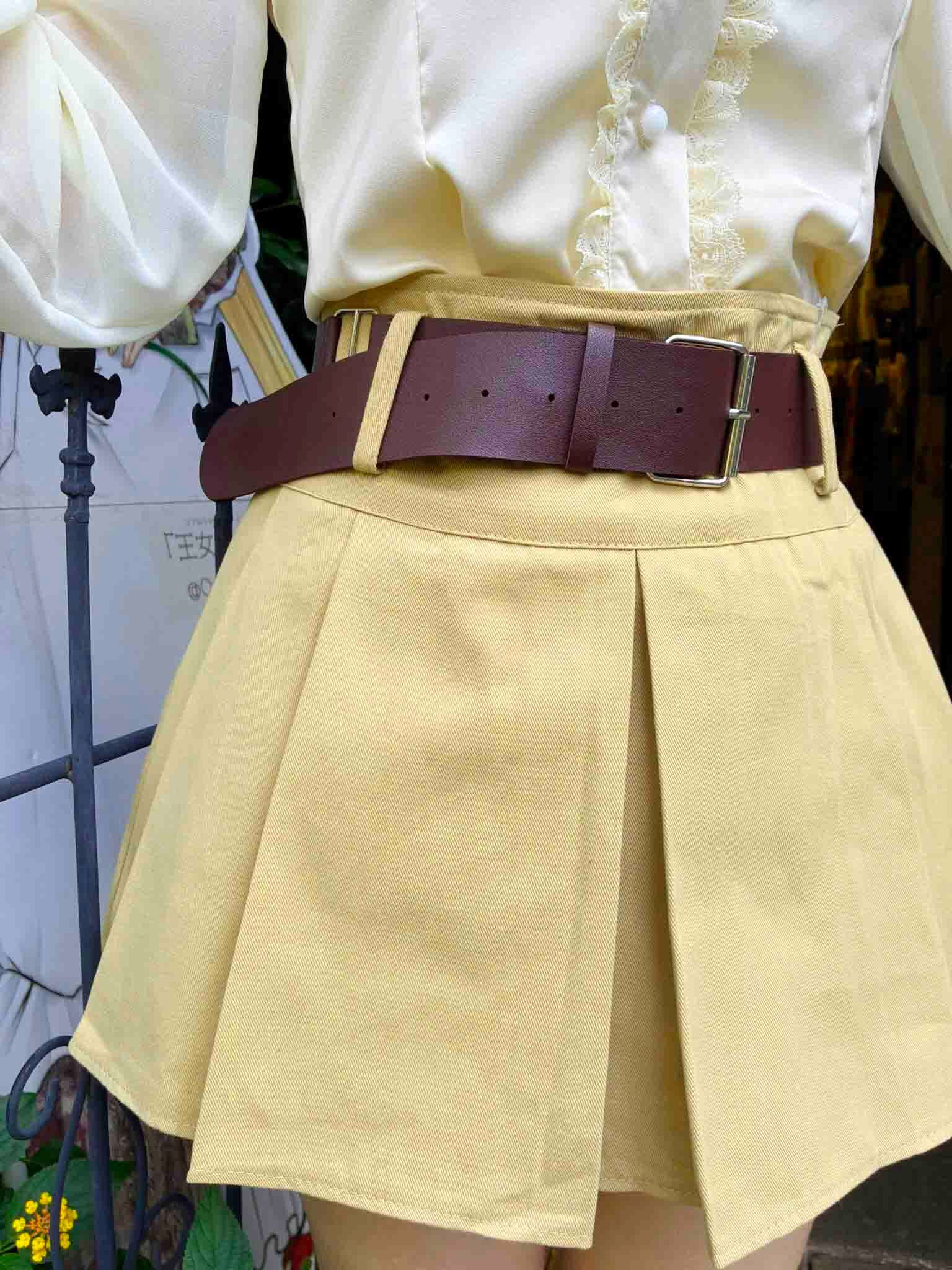 大きめプリーツ、そして幅広のベルトでくっきりとしたスカートシルエットを作ります。