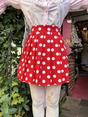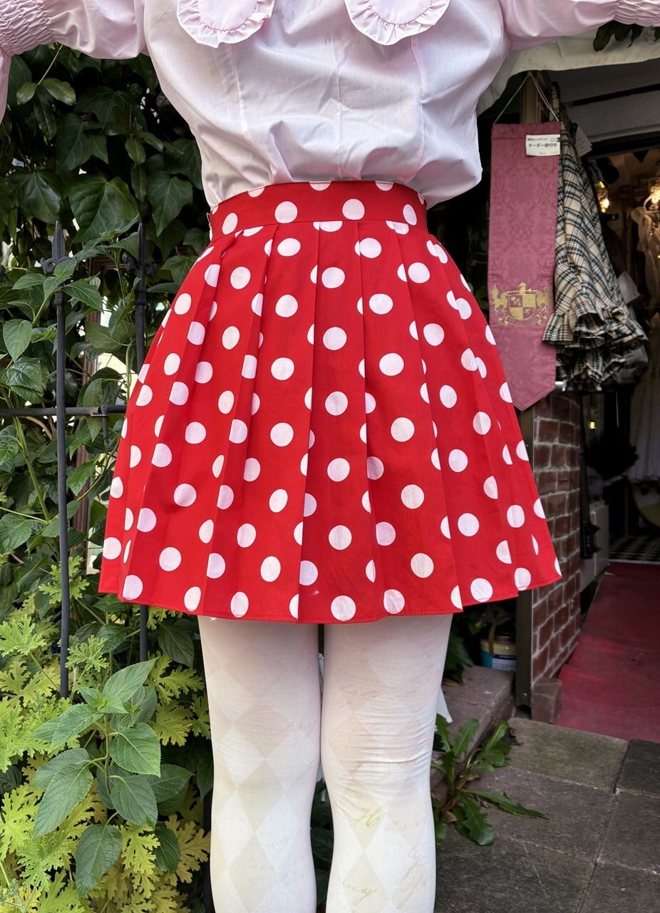 大きなピンクの水玉柄が特徴的なミニプリーツスカートです。
