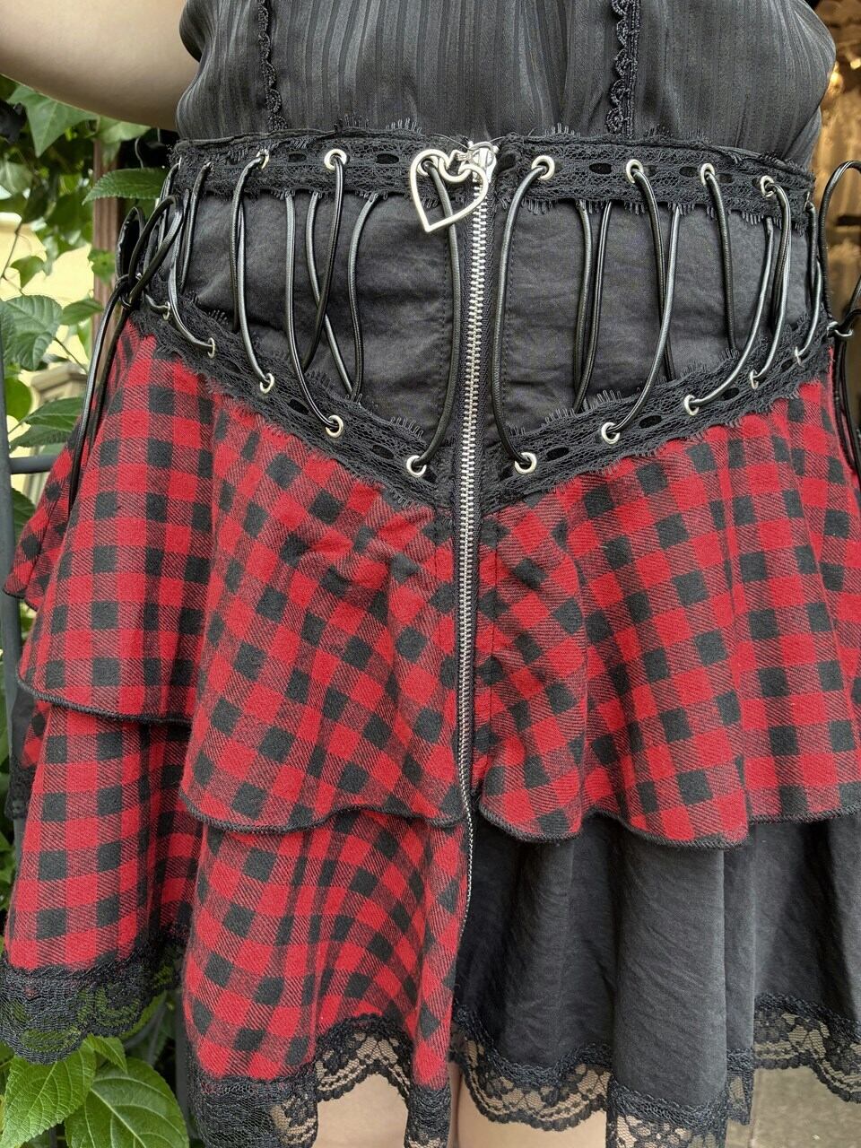 ハートファスナーとスピンドルの赤チェックフリルスカート