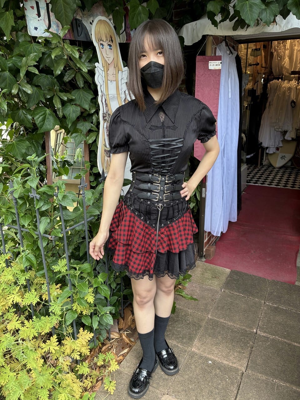 赤チェック生地と黒生地のアシンメトリーデザインが動きに合わせて軽やかに揺れ、あなたの魅力を引き立てます。