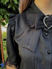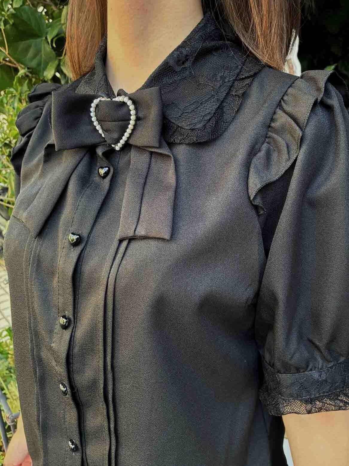 ハートパールリボンとレース重ね丸襟のハートボタン半袖ブラウス 黒