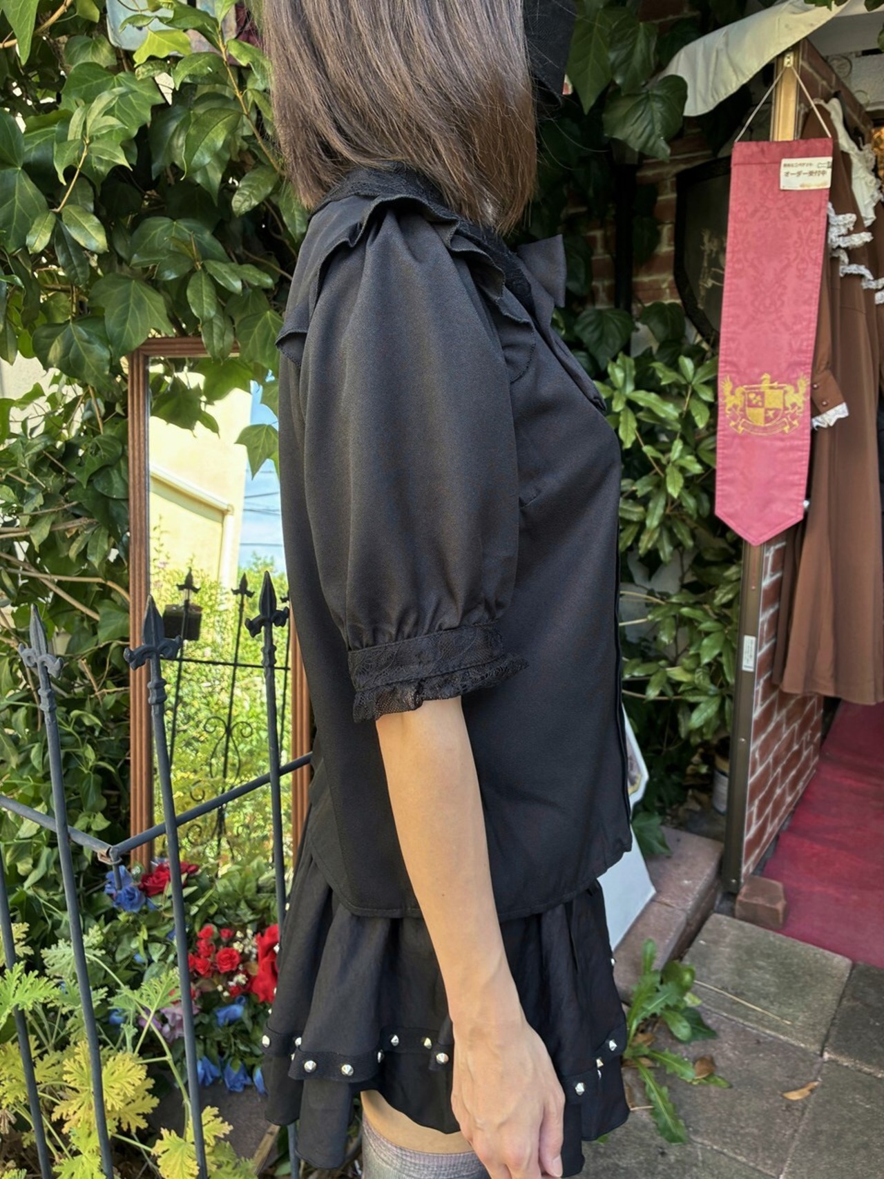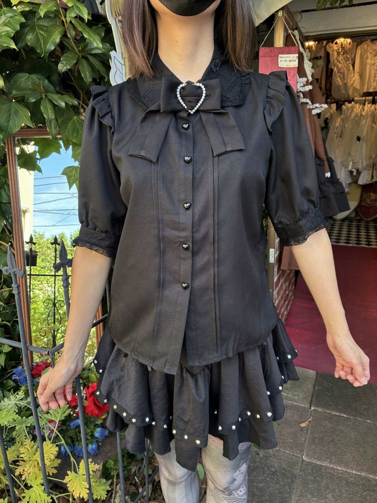フリルブラウス ハートパールリボンとレース重ね丸襟ハートボタン半袖ブラウス 黒