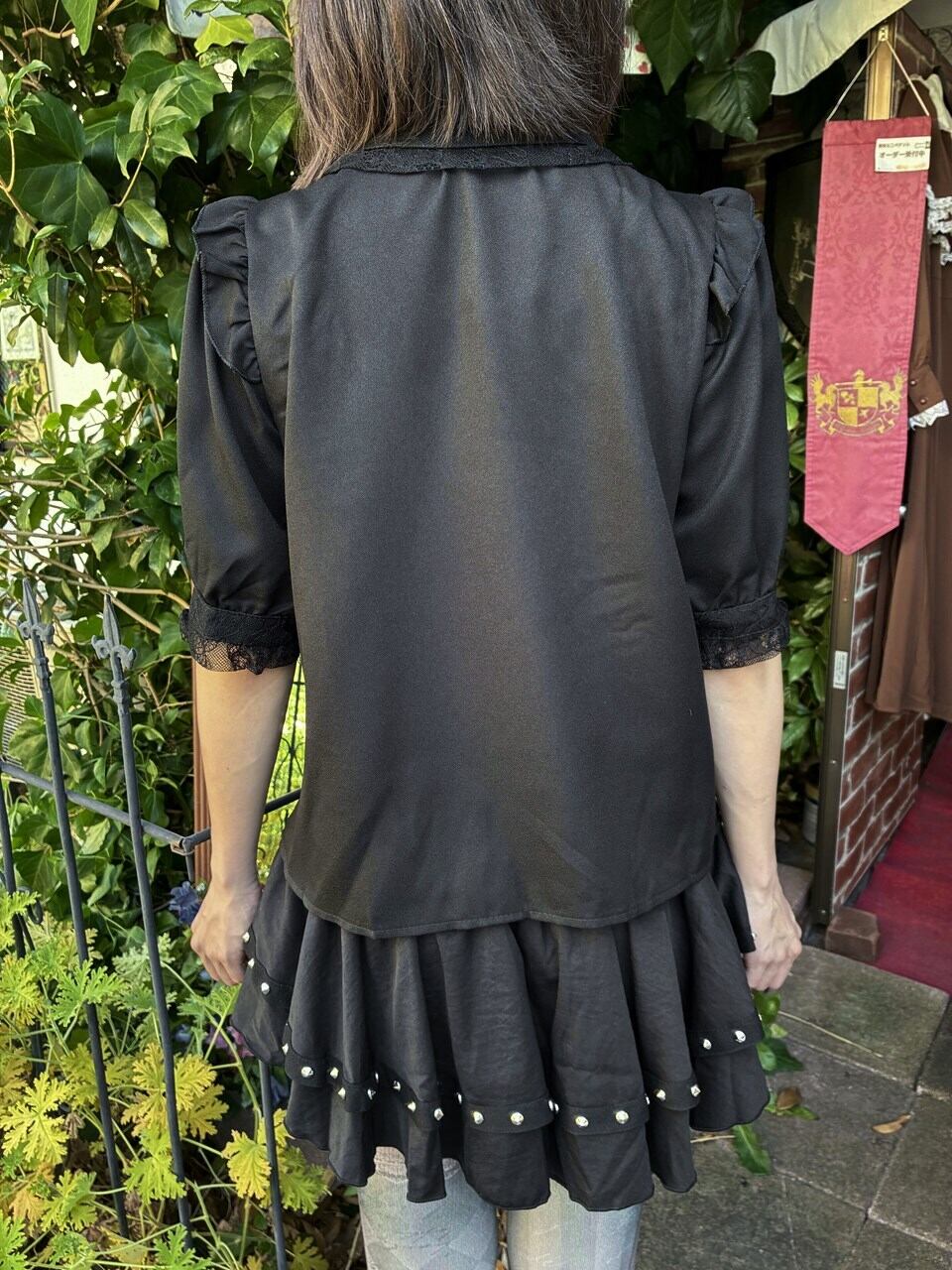 フリルブラウス ハートパールリボンとレース重ね丸襟のハートボタン半袖ブラウス 黒