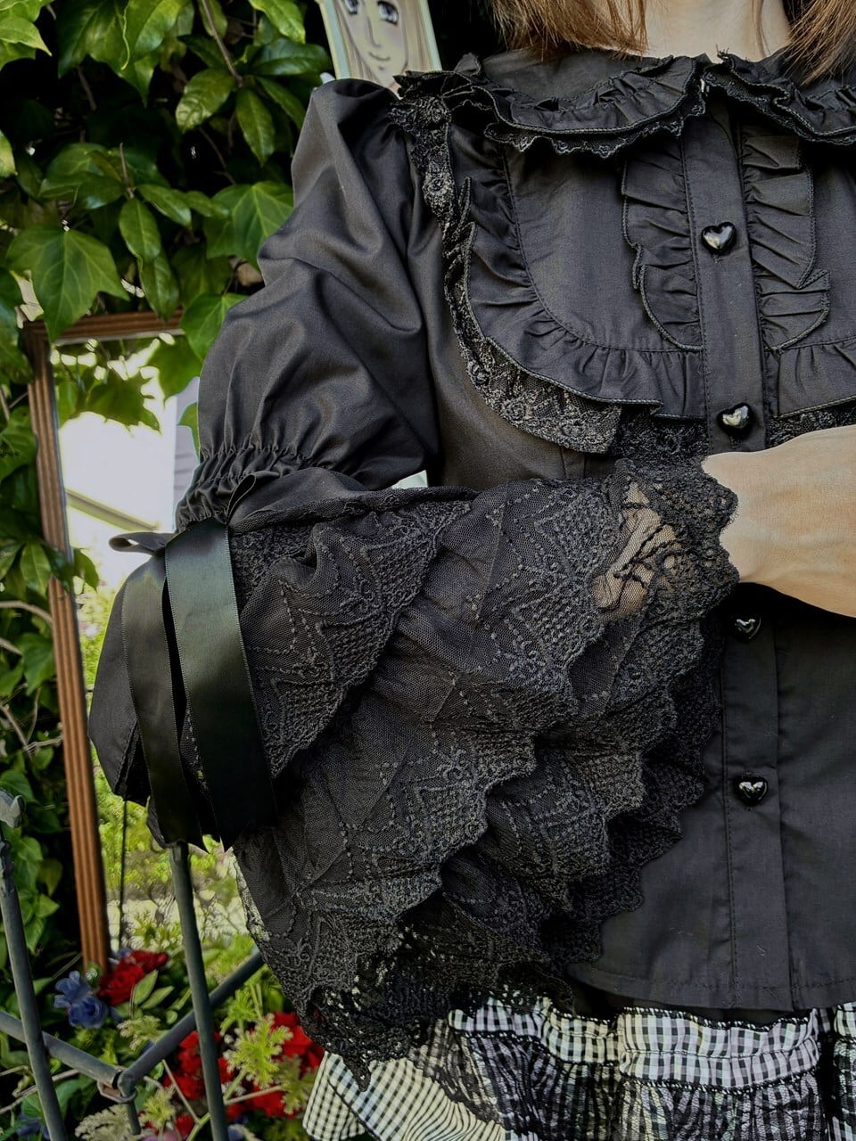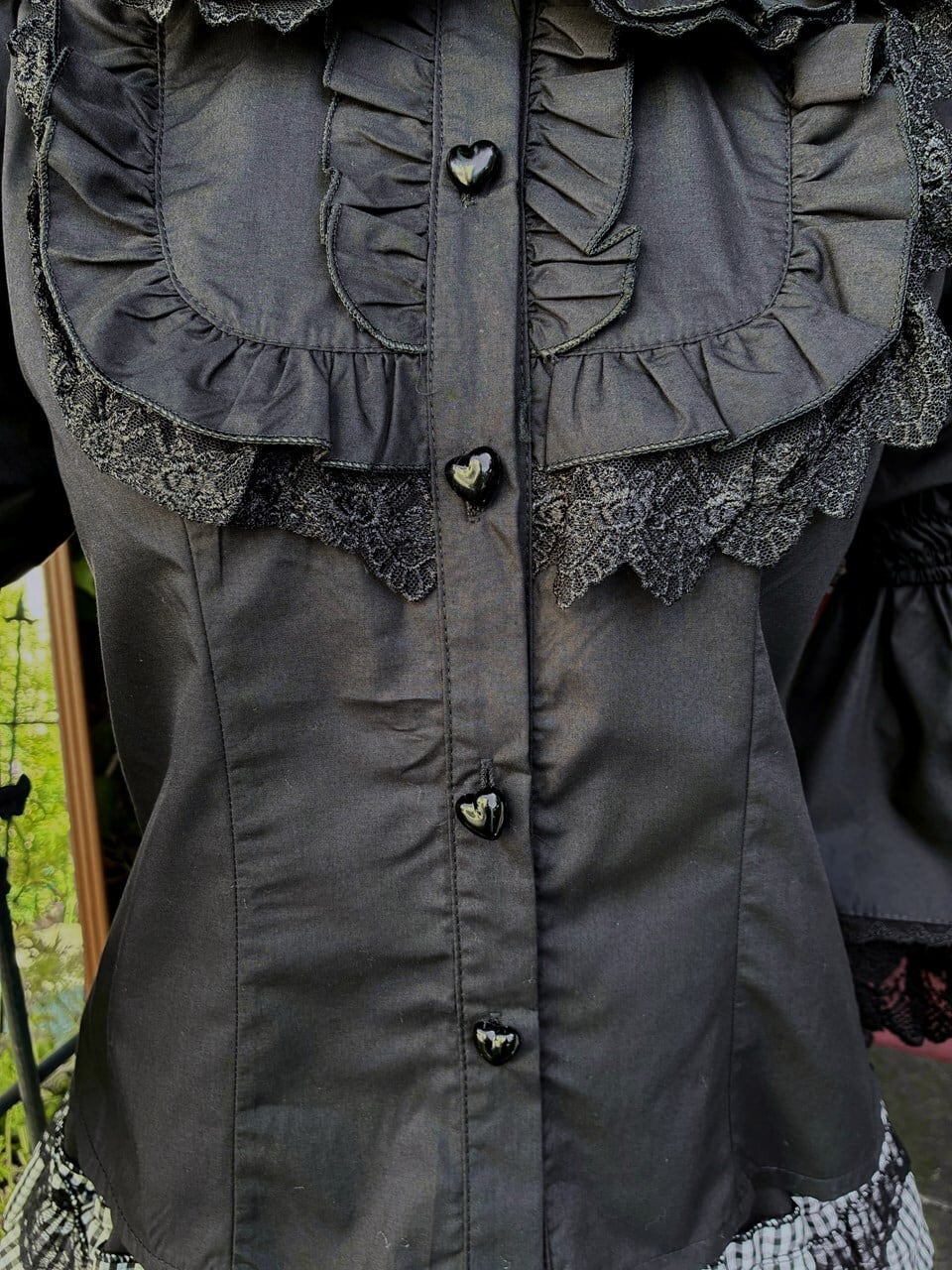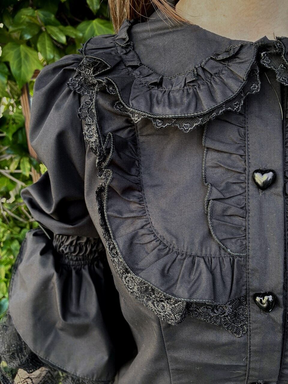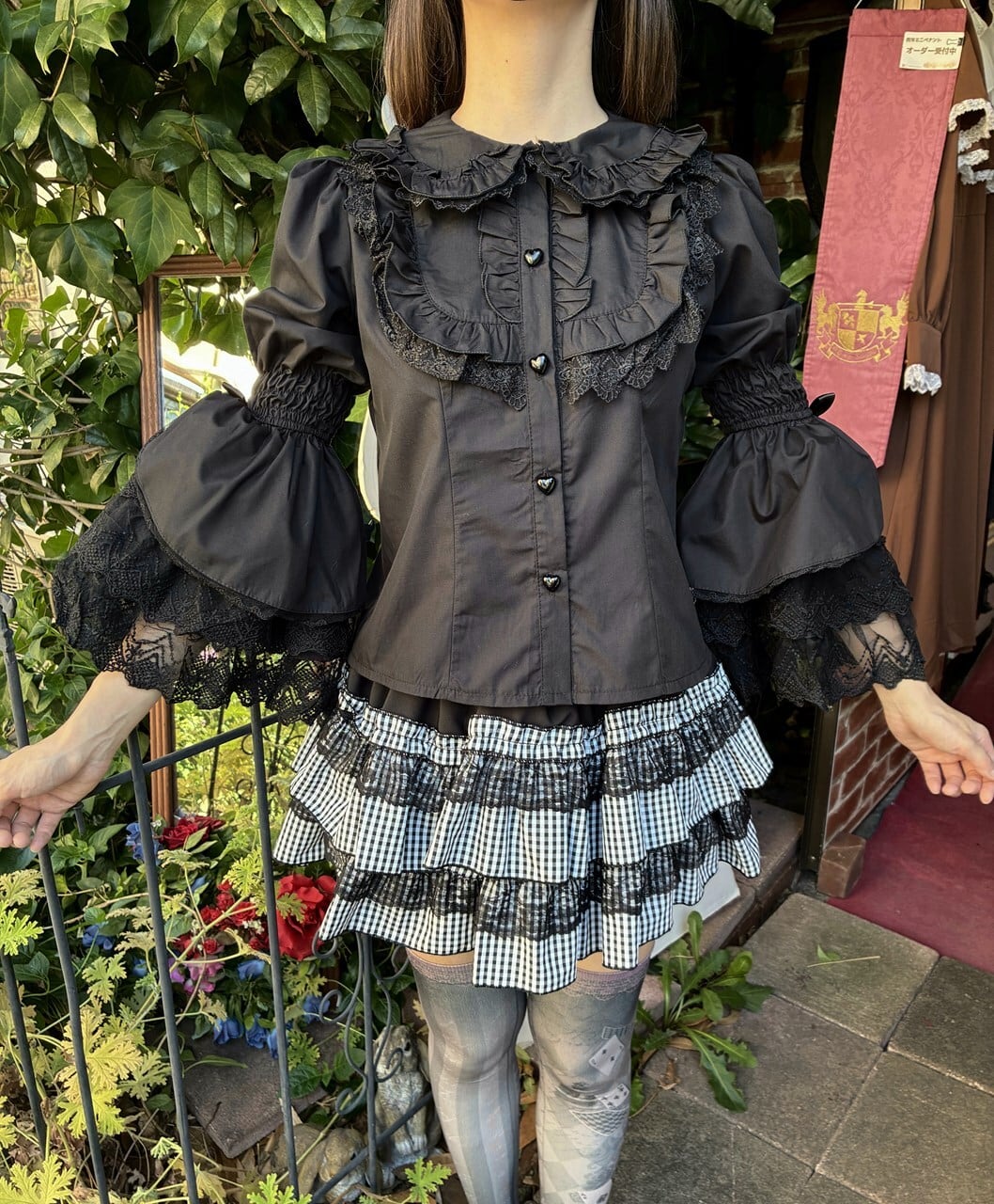 フリルブラウス 4段レース姫袖とハートボタンのうさみみ丸襟フリルブラウス 黒