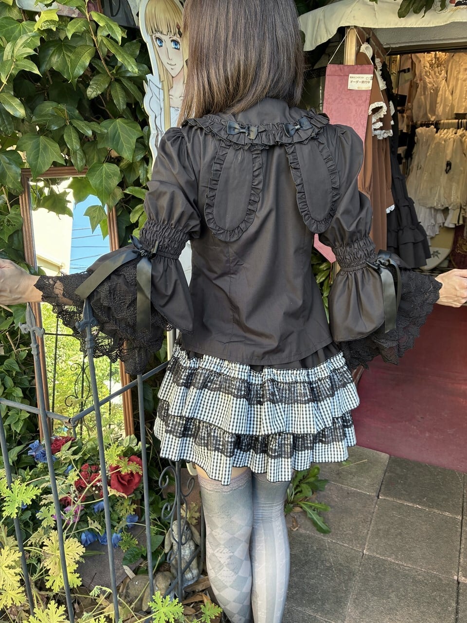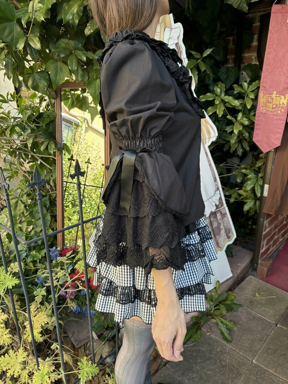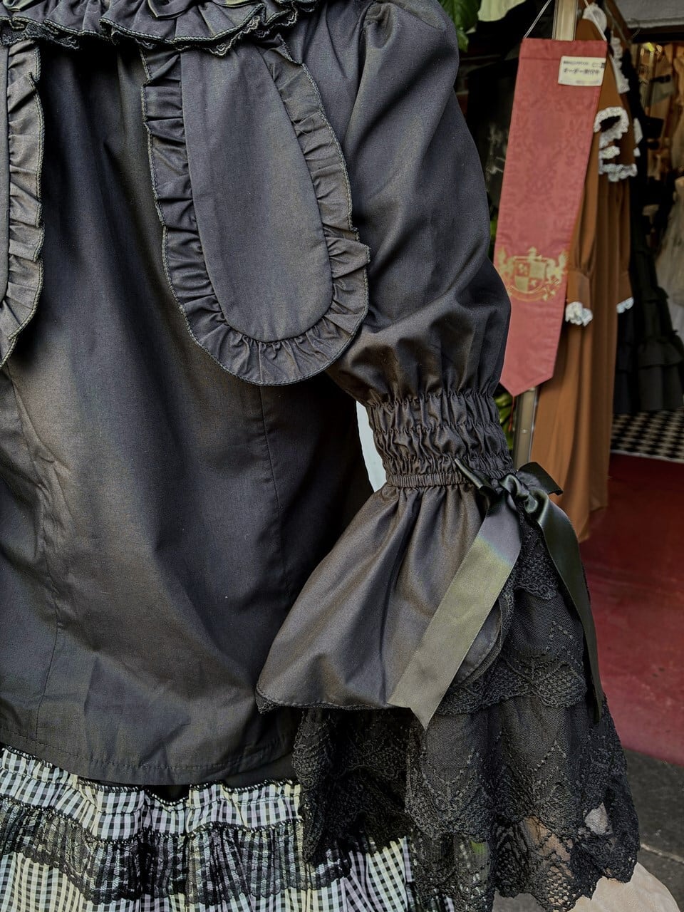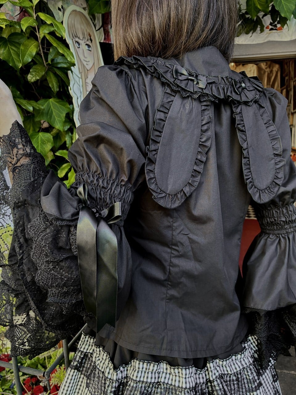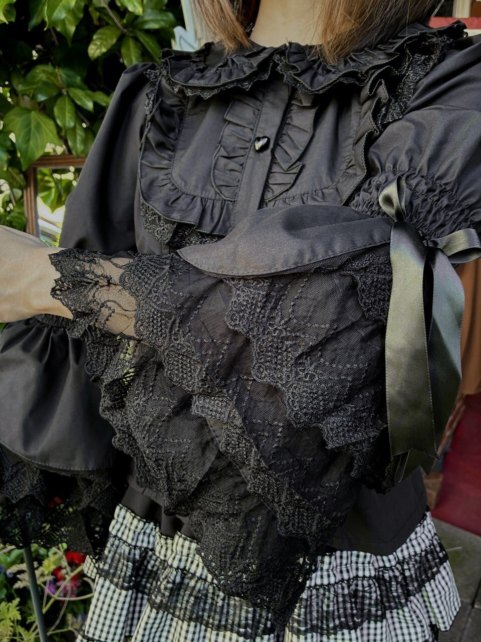 フリルブラウス 4段レース姫袖とハートボタンのうさみみ丸襟フリルブラウス 黒