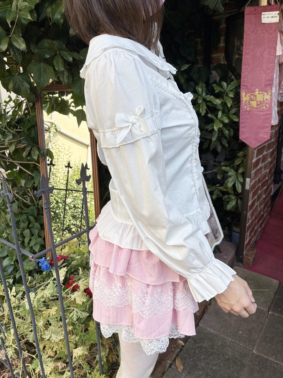 襟と袖にはキュートなリボンが施されており、ふんわりとした袖と相まって柔らかな雰囲気を作ってくれます。