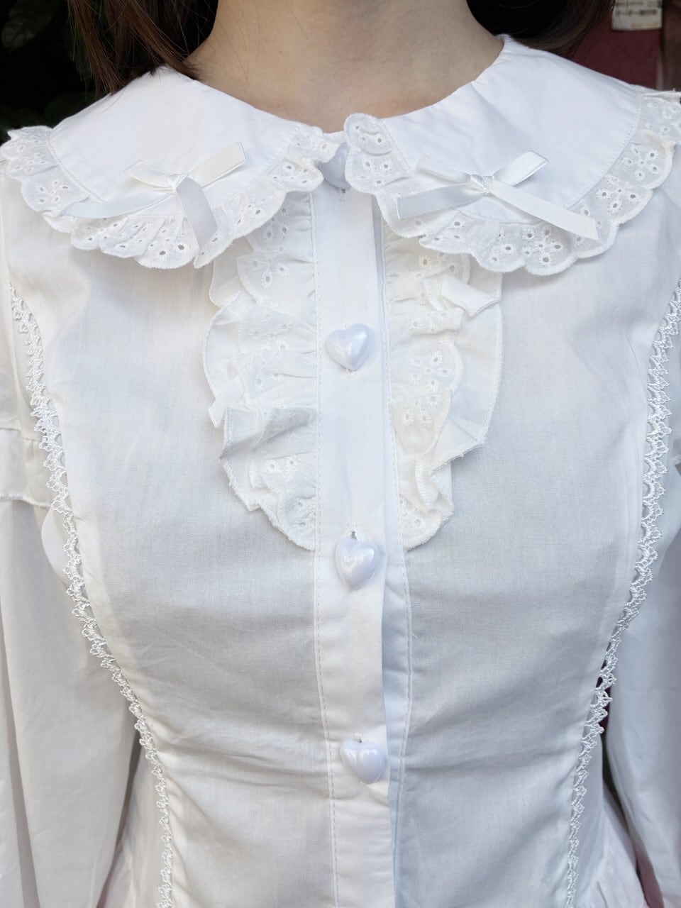胸元ミニフリル飾りと丸襟リボンのハートボタンフリルブラウス 白