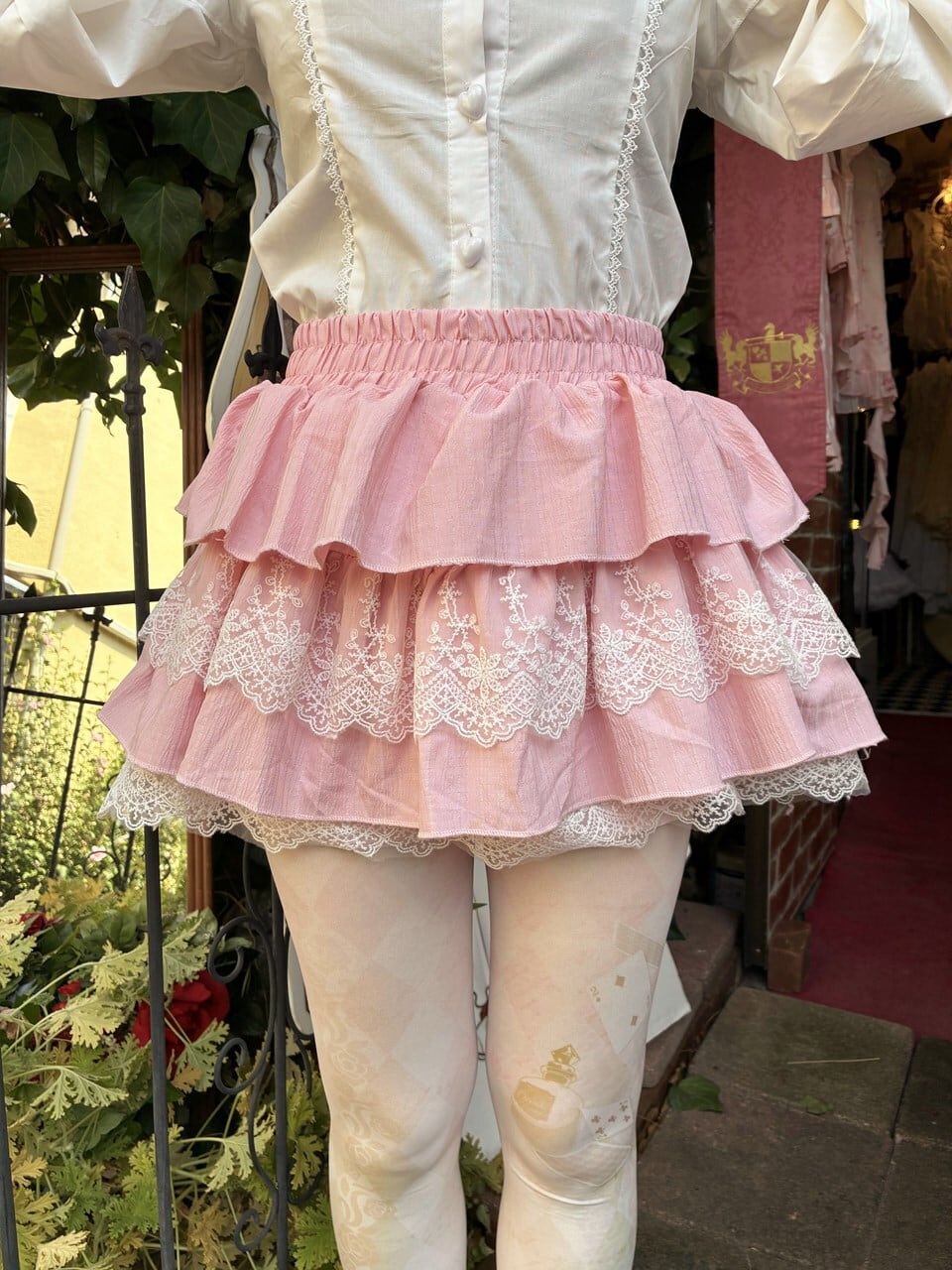 ホワイトレース重ねサーモンピンクスカートパンツ
