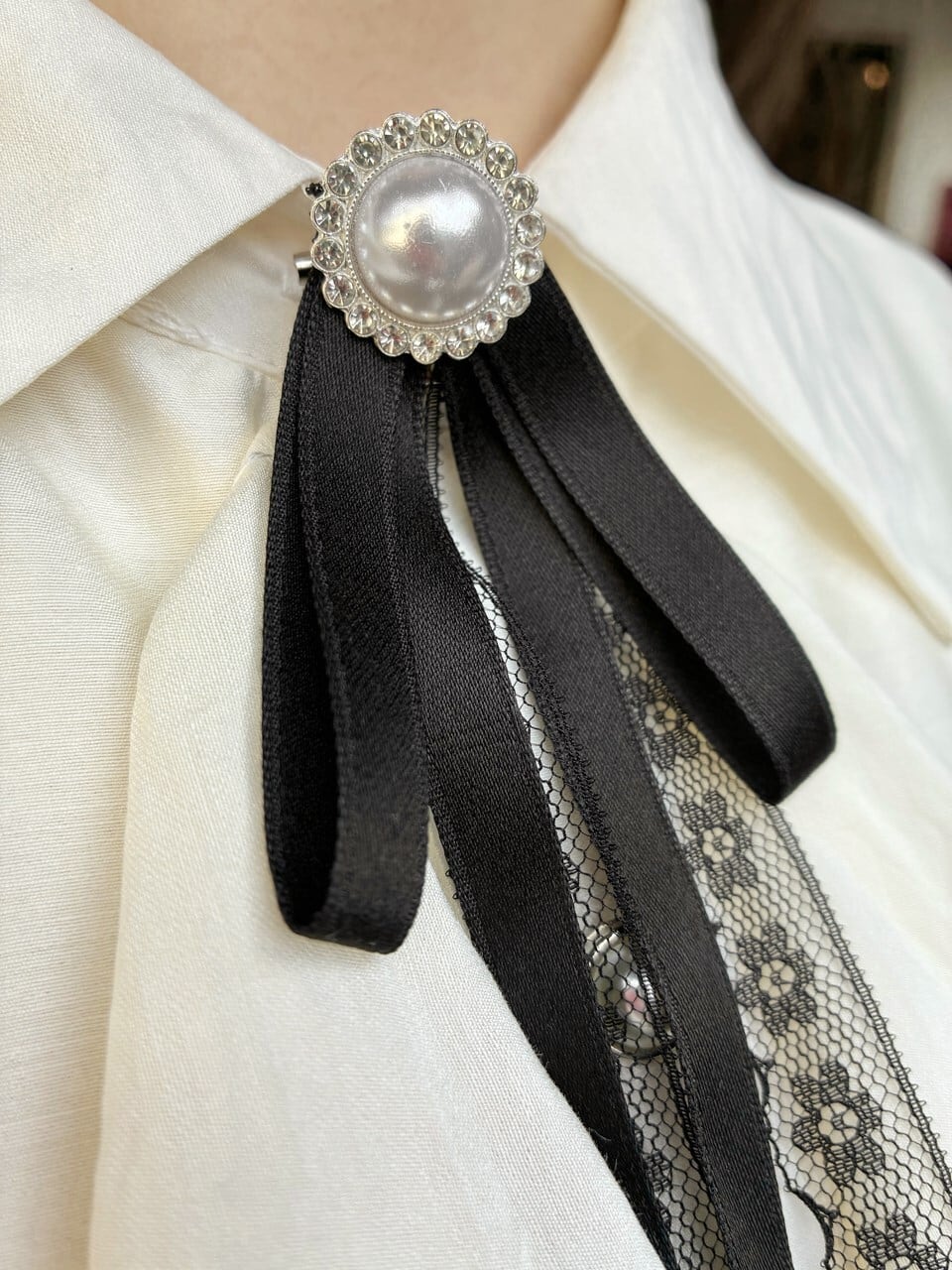 三角襟の中央に添えられた輝くパールアクセの黒リボン飾りが、貴族ちっくな魅力をさらに引き立てるデザインです。