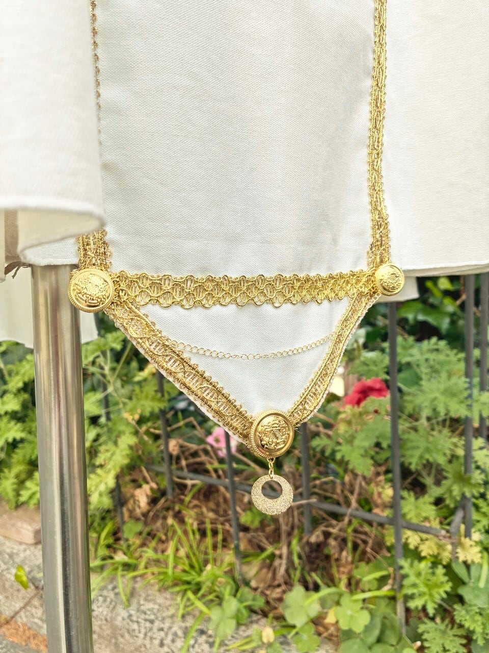 月の光の神聖さと明るさを、白い生地と金系の装飾を用いて表してみました。