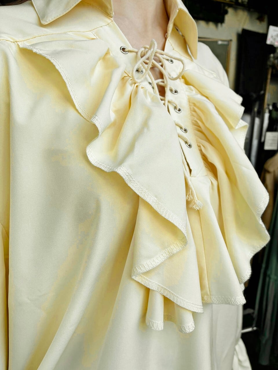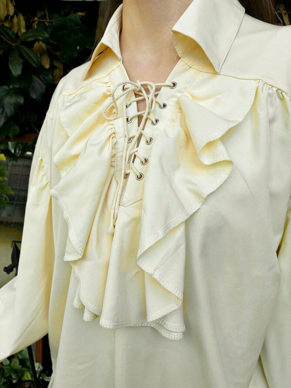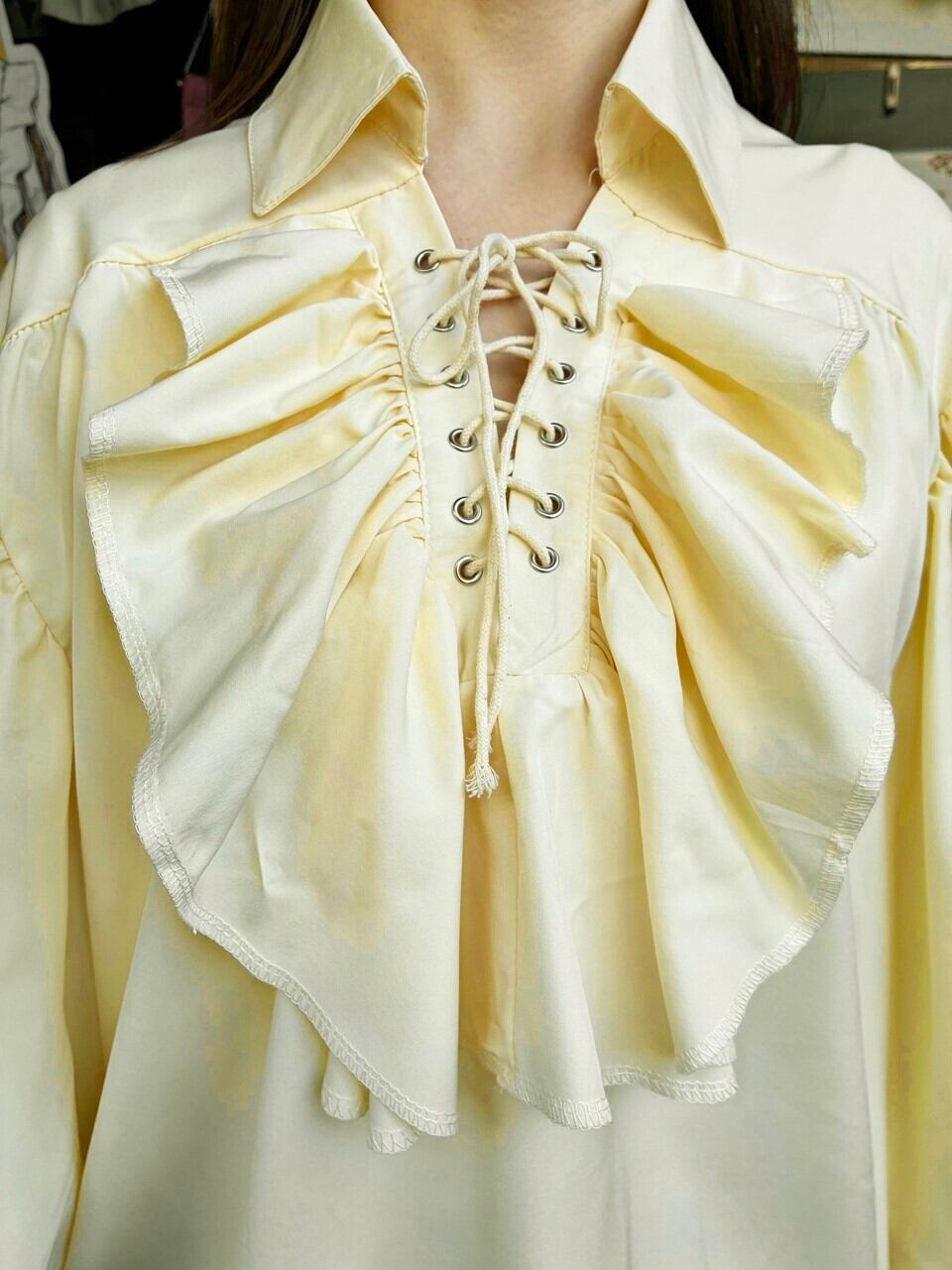 このフリルブラウスは、可憐なクリームイエローの色合いが特徴で、胸元の三角編み上げとボリュームのあるフリルが貴族的な印象を与えます。