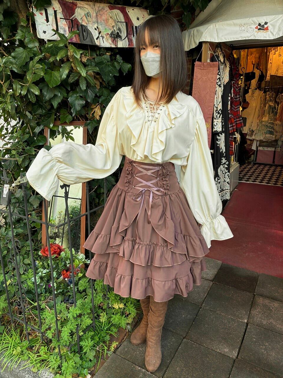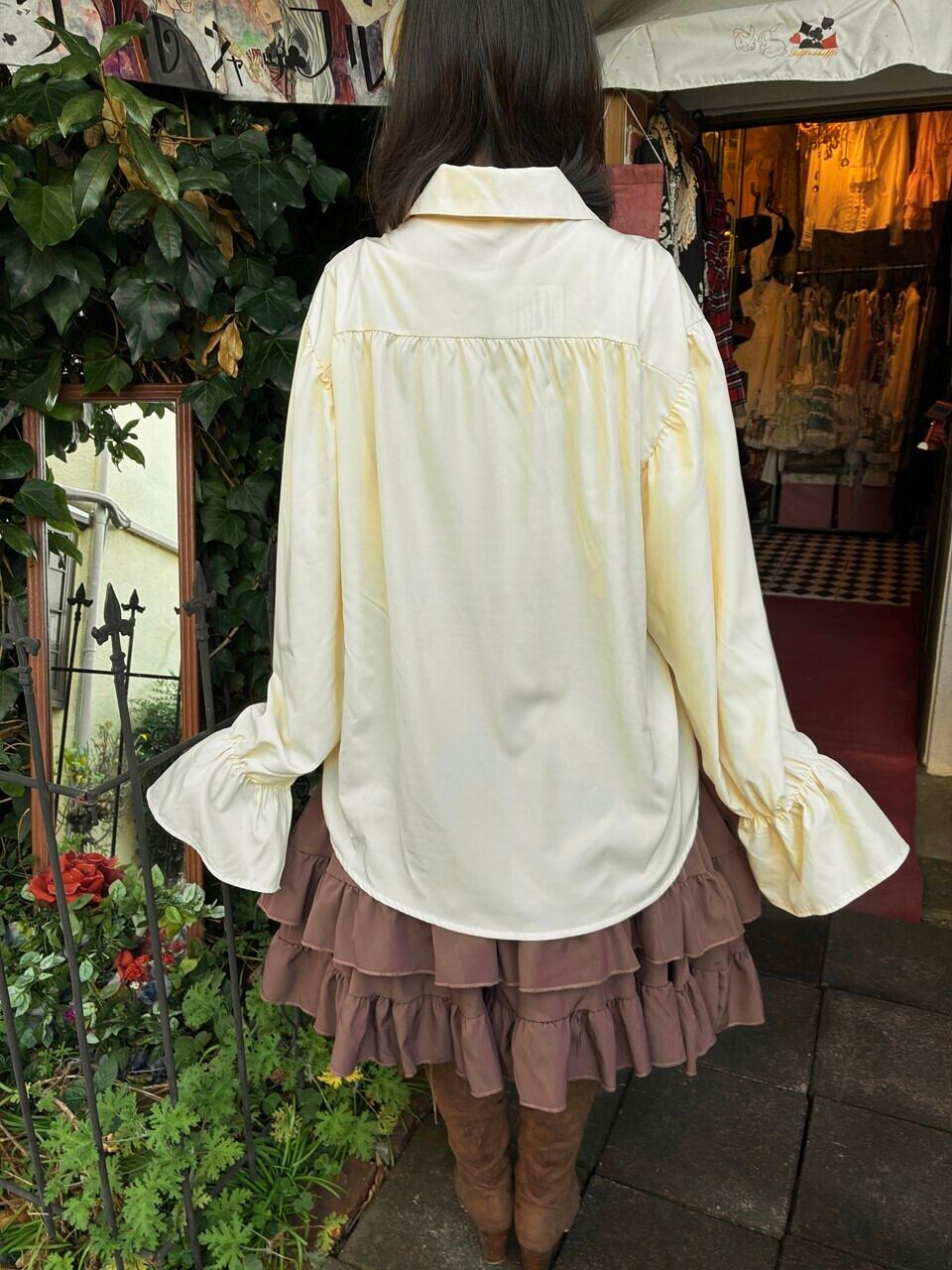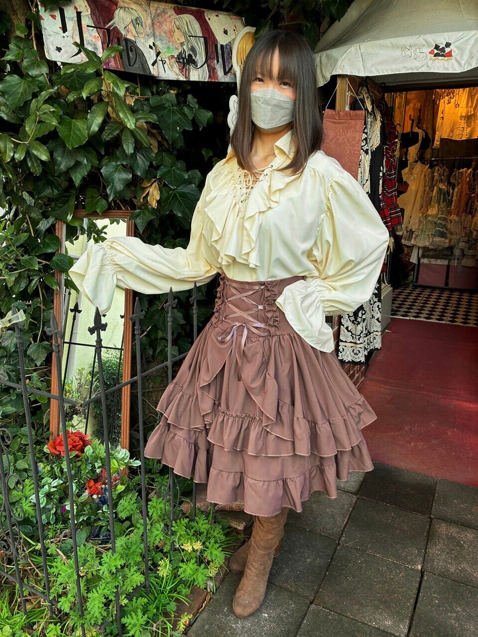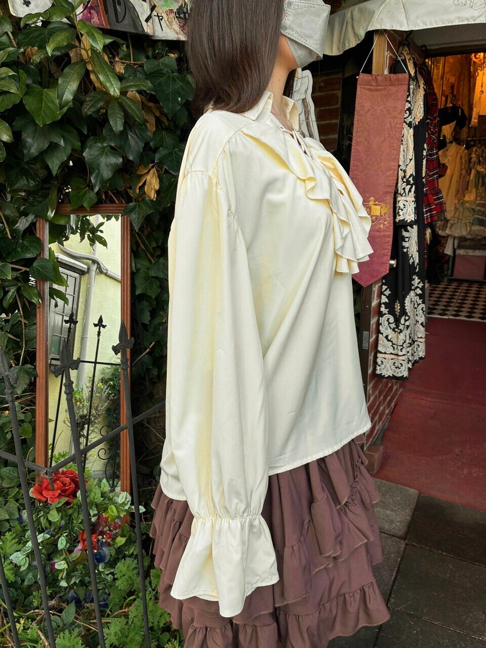 このフリルブラウスは、可憐なクリームイエローの色合いが特徴で、胸元の三角編み上げとボリュームのあるフリルが貴族的な印象を与えます。