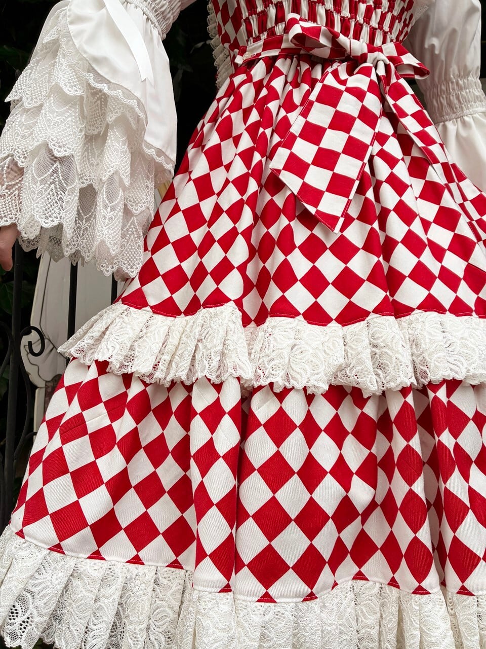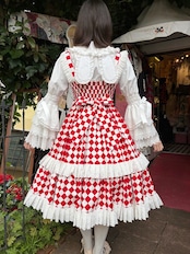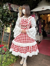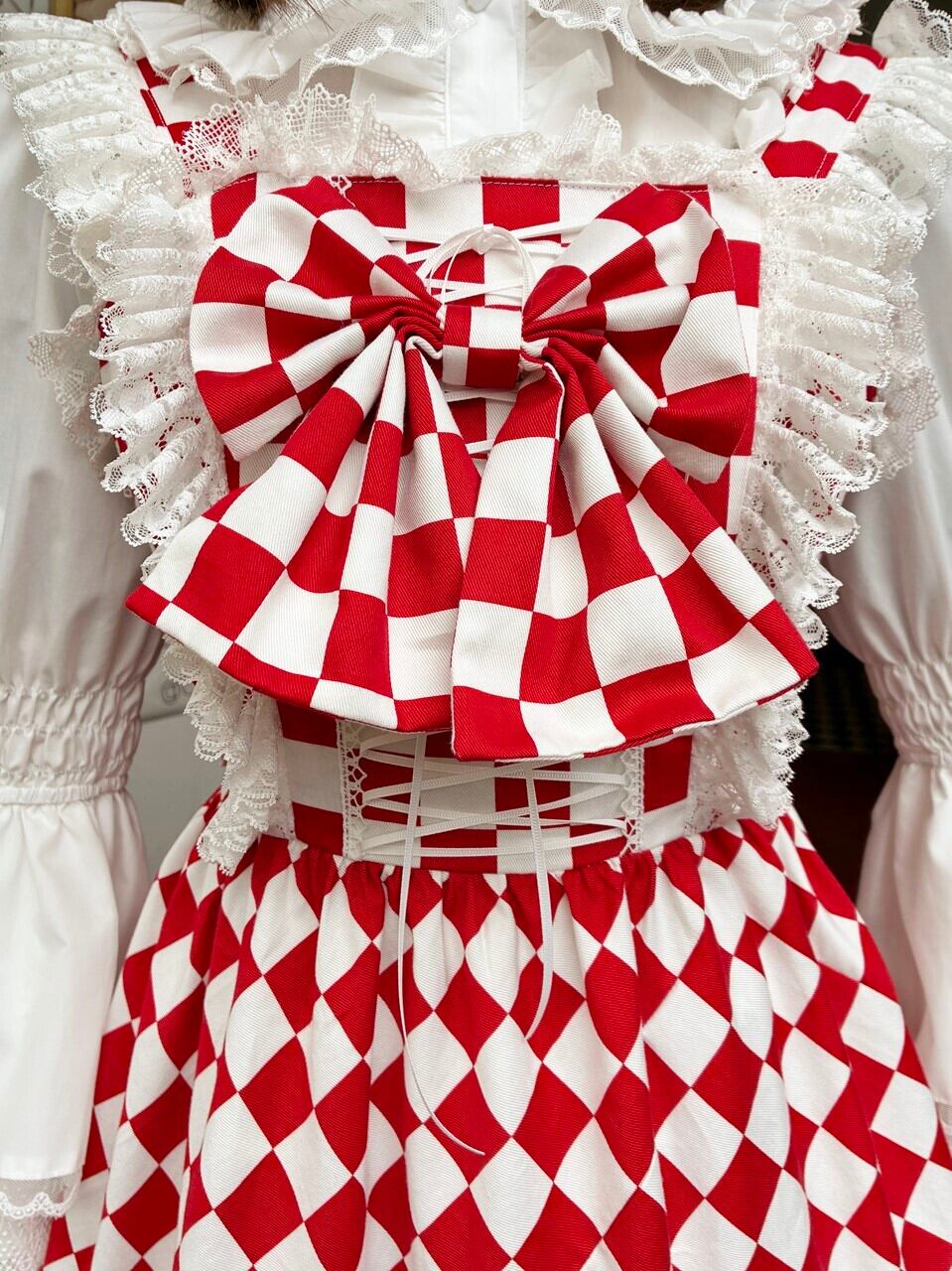 ダイヤチェックの2段フリル編み上げリボンOp 赤