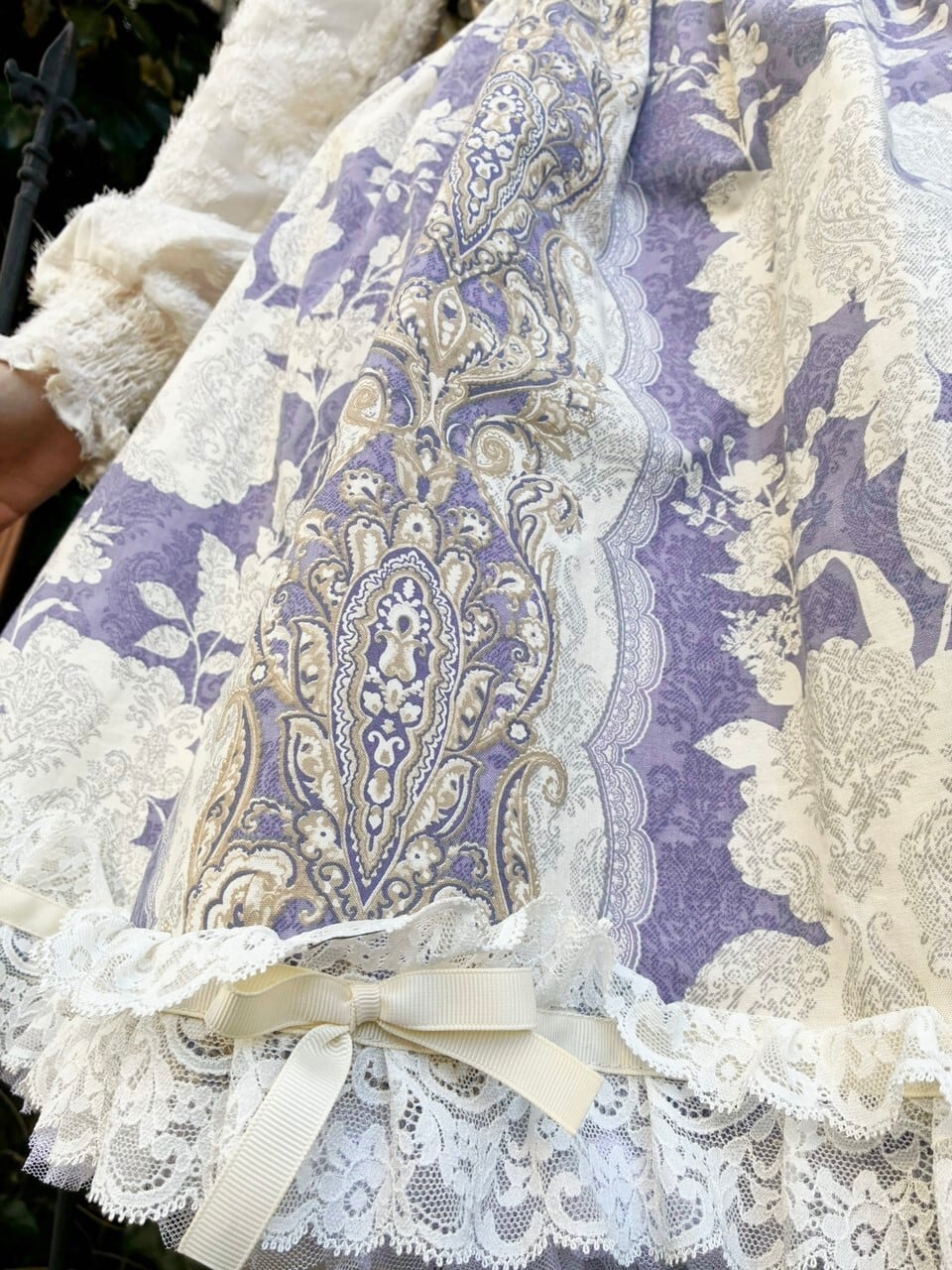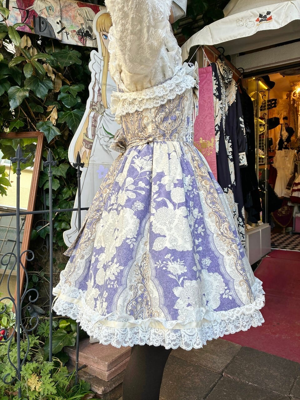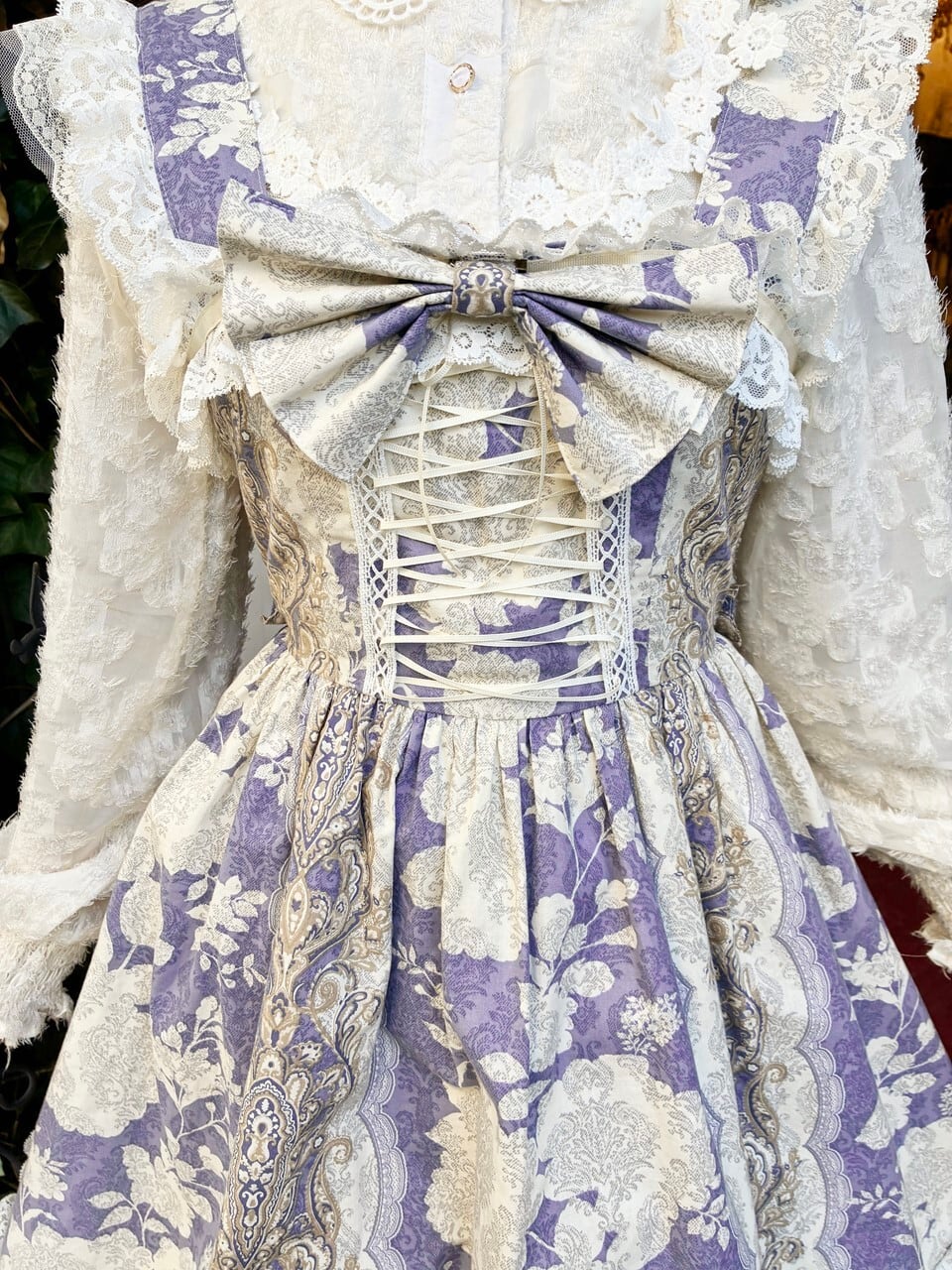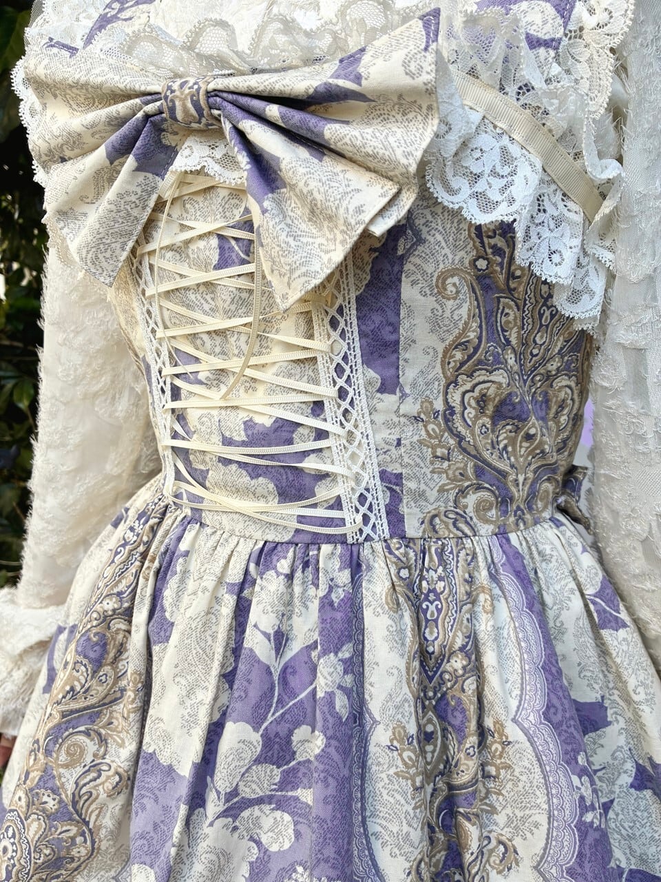 控えめなお姫様の日常のお洋服としてご愛用頂けるよう、バロック柄で落ち着いた色味の生地を使って制作しました。