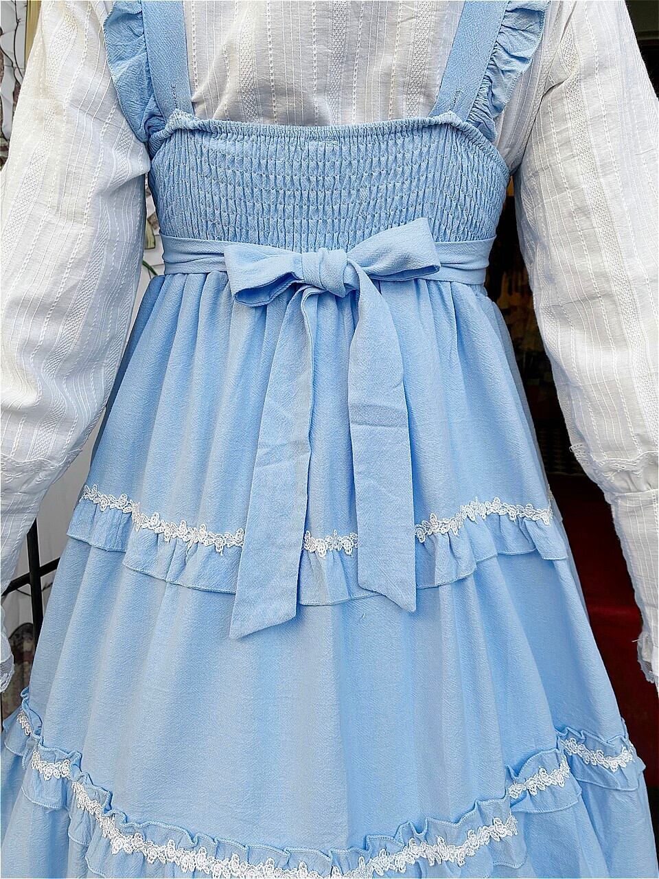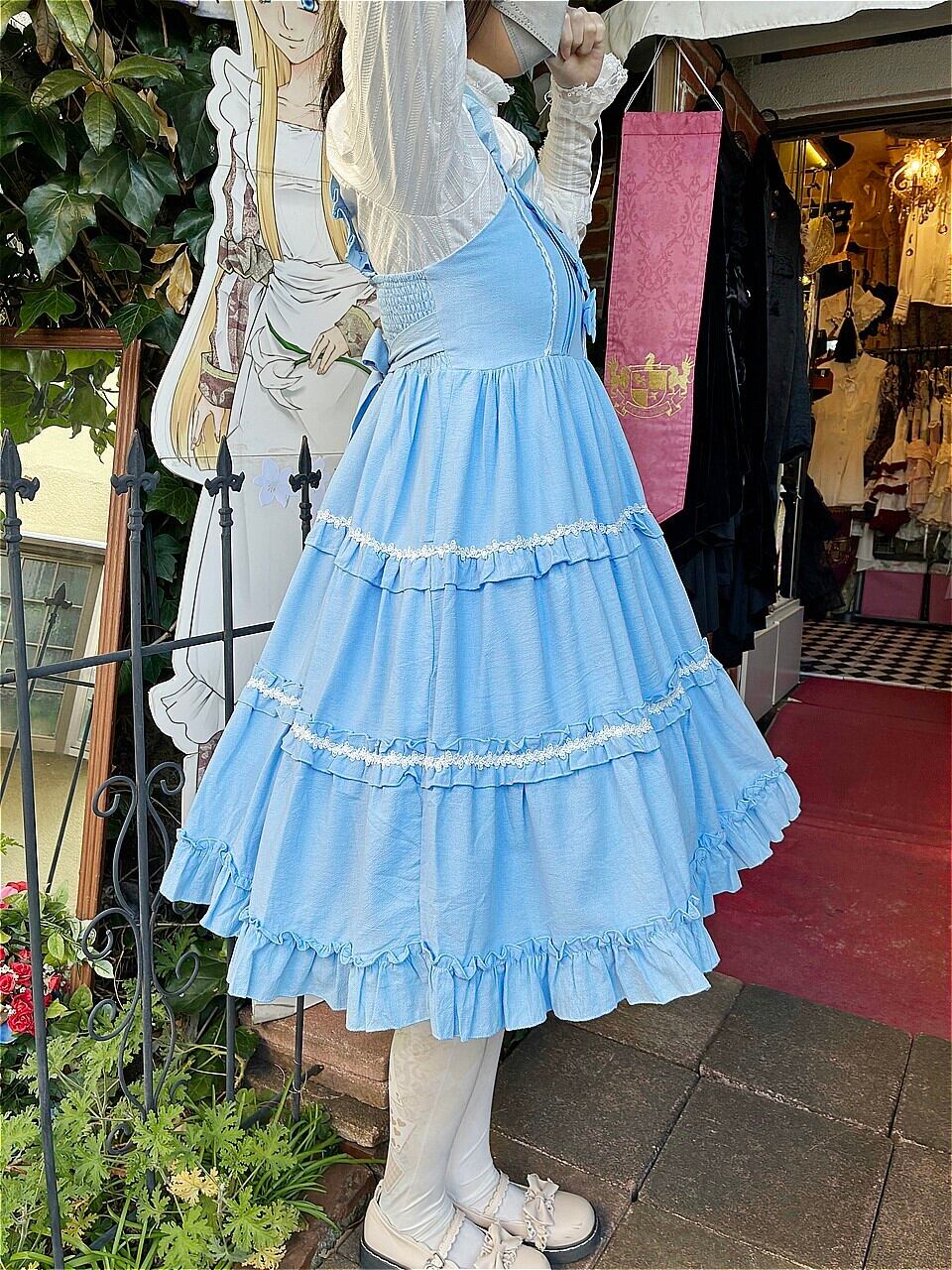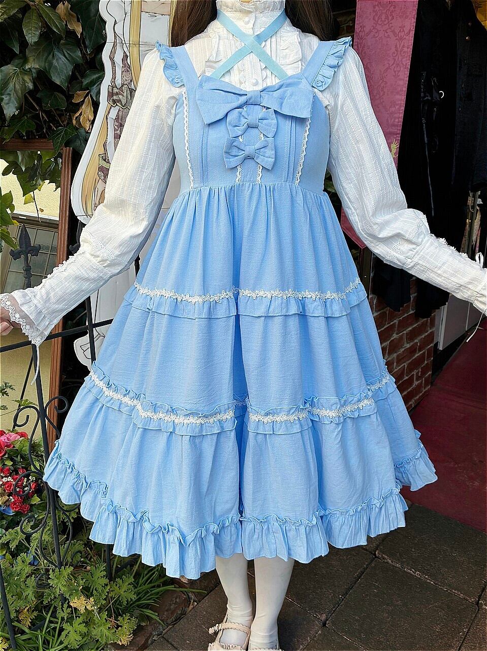 スカート部分には3段のフリルと白いバラのレース飾りが施され、より女性らしさを引き立たせています。