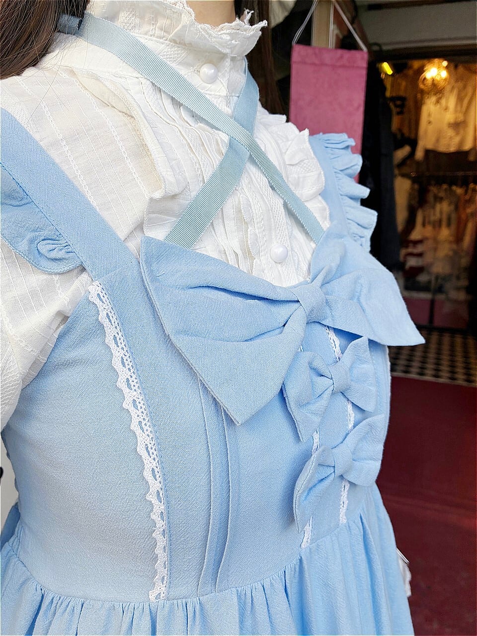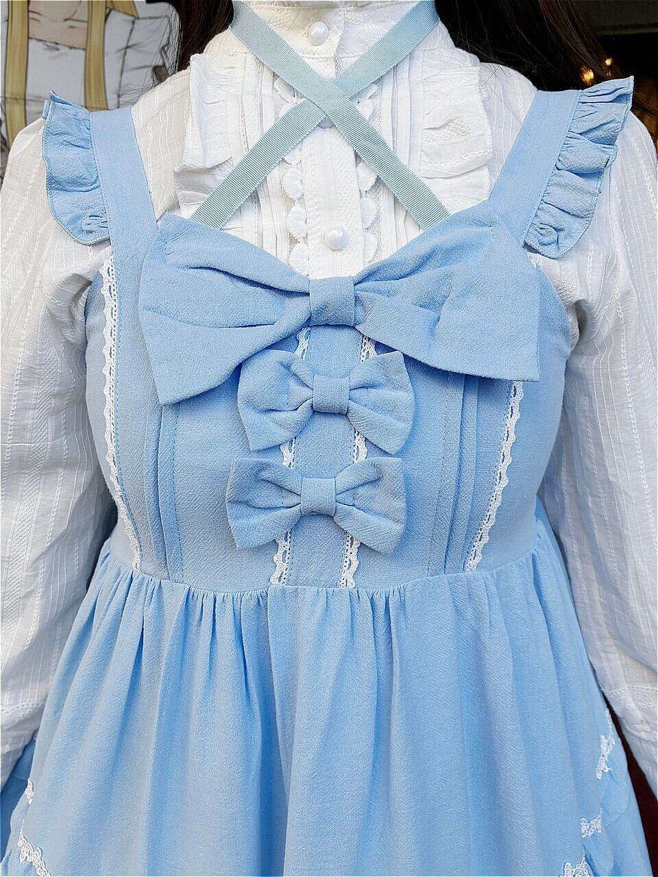 胸元にはリボンが3つ。スカート裾にもホワイトリボンが付いています。