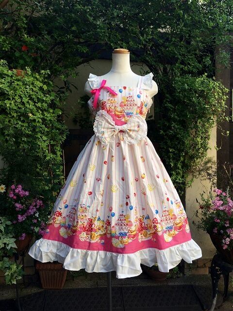 森の動物たちが集まって楽しくお茶会をしている可愛らしいプリント柄に、フリフリひらひらのフリル付き肩ひも、そしてふんわりスカートがとっても魅力的。