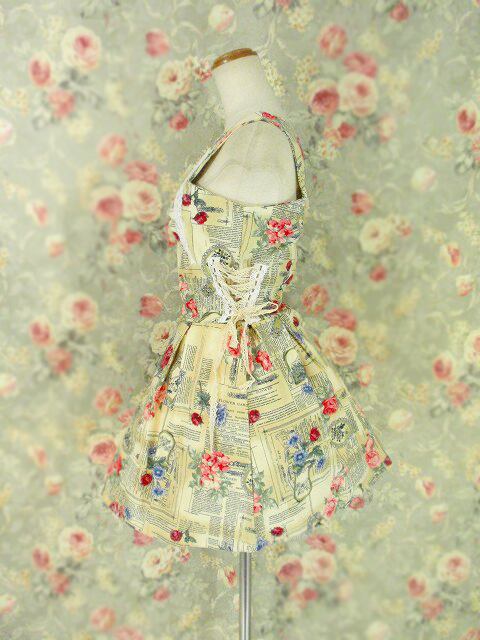 薔薇柄ベージュ フリルの綿レースと編上で可愛く飾られたクラシカルレトロな薔薇柄ワンピースです。