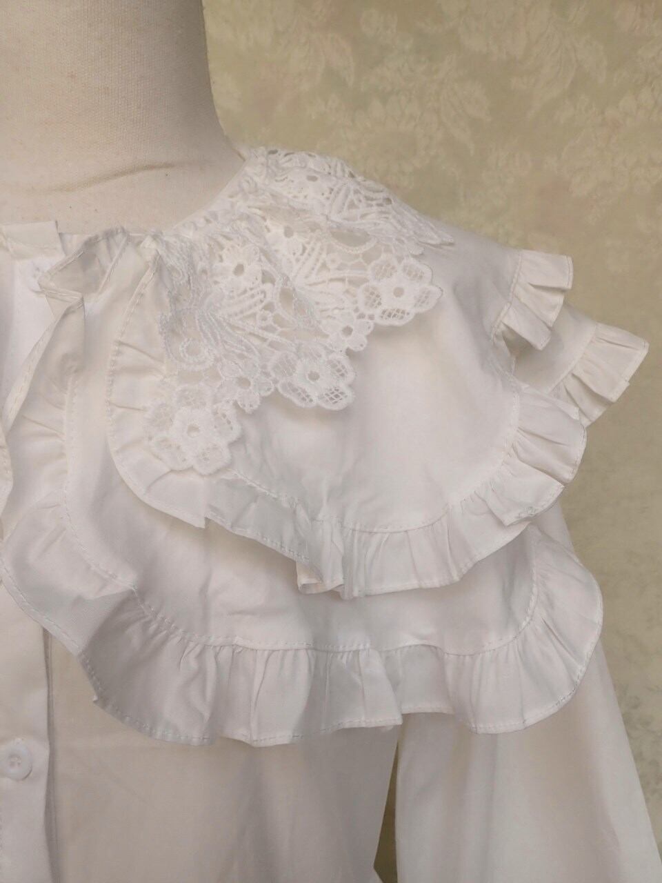 フリル襟とお花のトーションレースがケープのように大きく広がったかわいいフリルワンピースです。
