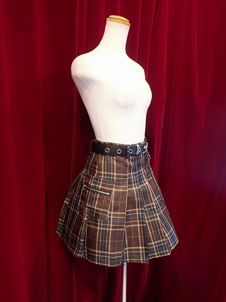 ダークブラウンチェックのプリーツキュロットスカート ポケット&チェーン付き