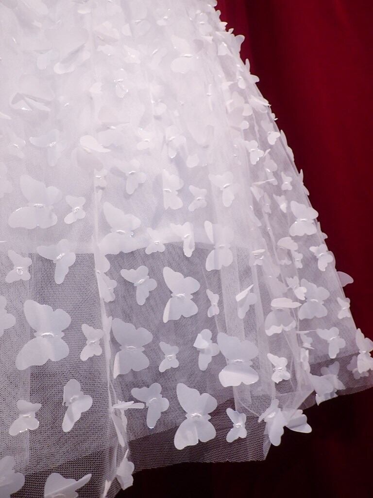 ふんわりと広がる2層の優しいチュール生地。その表生地いっぱいに、小さな蝶々が刺繍で縫い留められています。