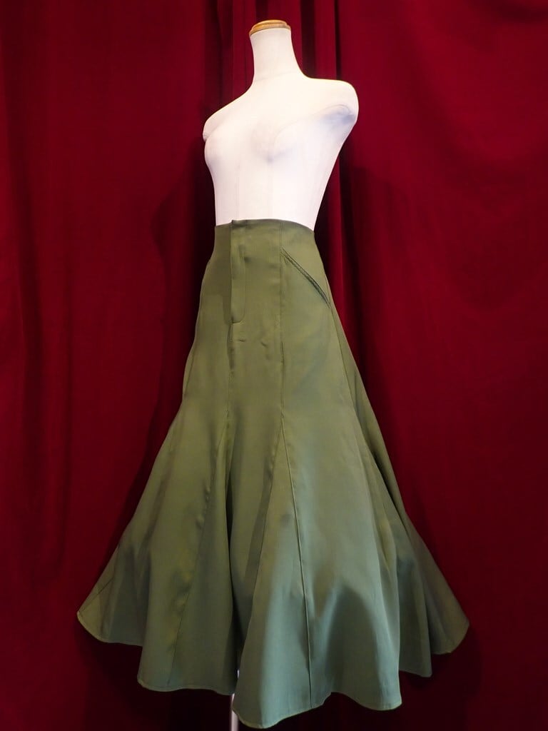 背面シャーリングポケット付きロング丈フレアスカート カーキ