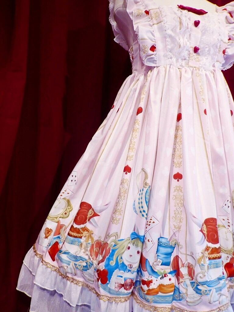 真っ白なレースやハートボタン、トランプモチーフのプリントなど、細部までこだわりのあるデザイン。