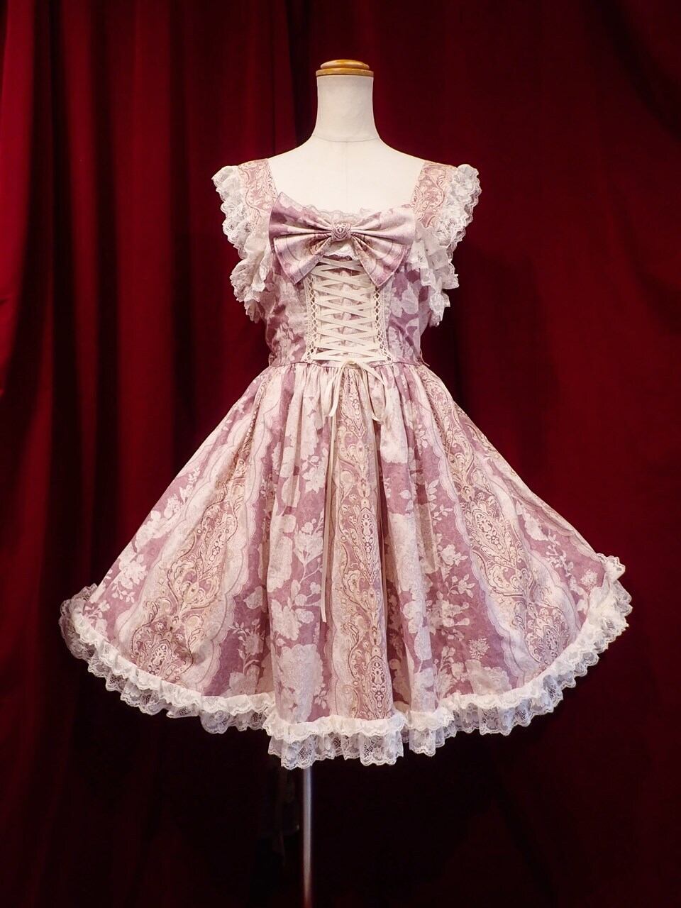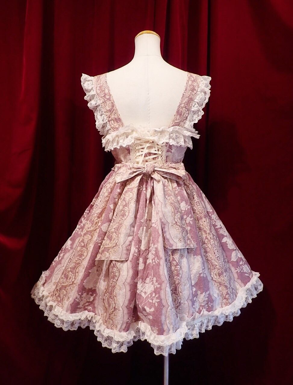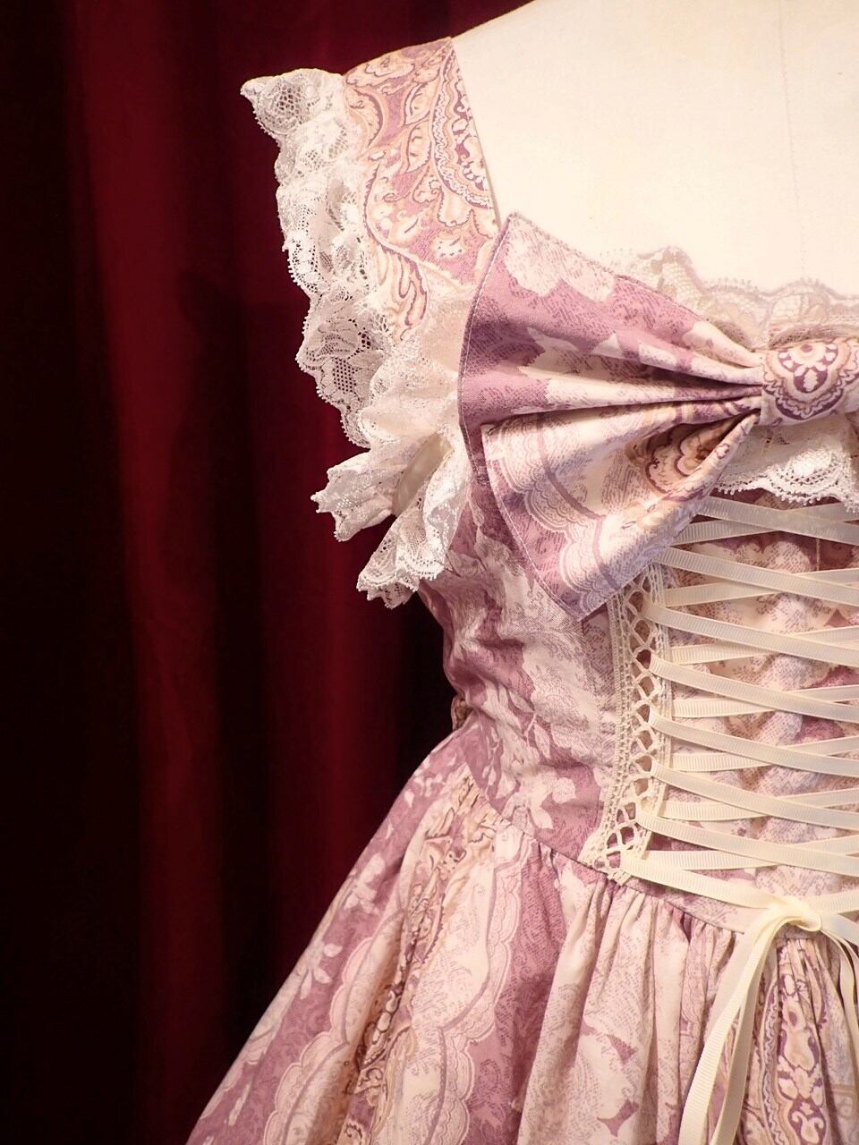 控えめのお姫様の日常のお洋服としてご愛用頂けるよう、バロック柄で落ち着いた色味の生地を使って制作しました。