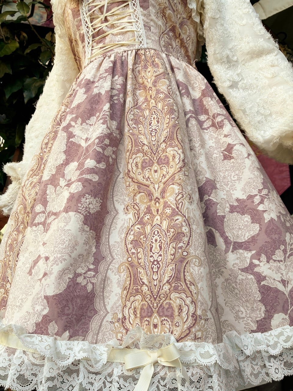 控えめなお姫様の日常のお洋服としてご愛用頂けるよう、バロック柄で落ち着いた色味の生地を使って制作しました。