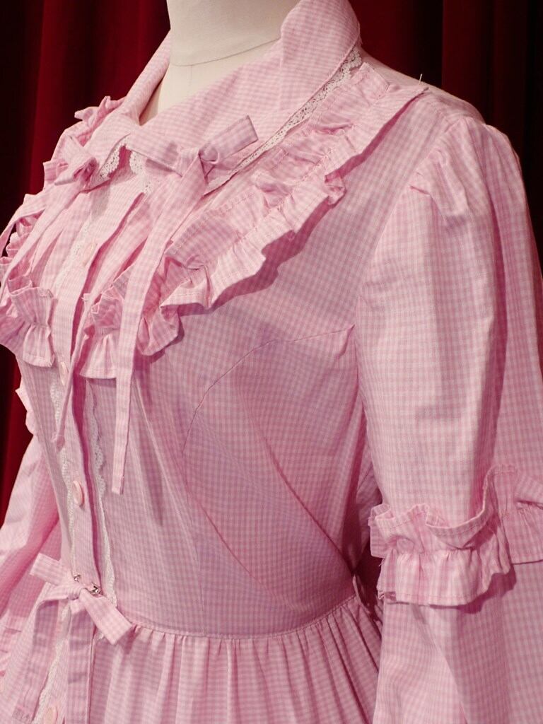 丸襟やボタン、袖口にはホワイトレースを飾り、ホワイトピンクのチェック柄の印象を更に明るくするようにデザインしました。