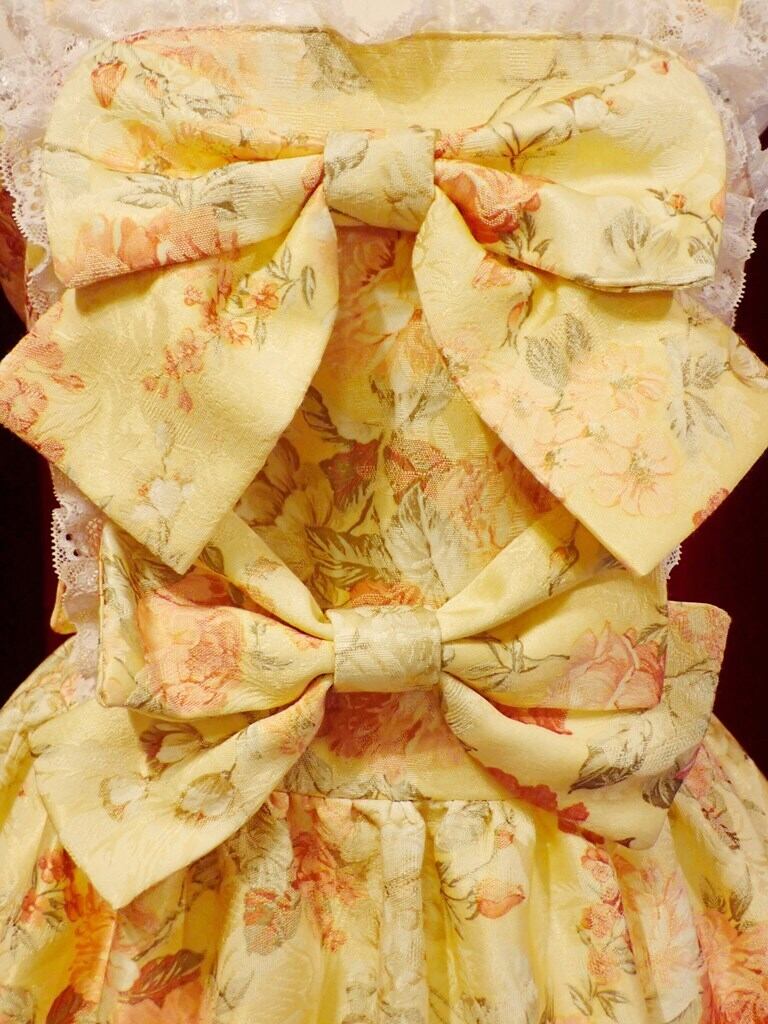 胸元の大きなリボンに加え、スカートには前面背面合わせて6個のリボンが付いており、またウエスト紐を結ぶことで背面に大きなリボンを作り出すことが出来ます。